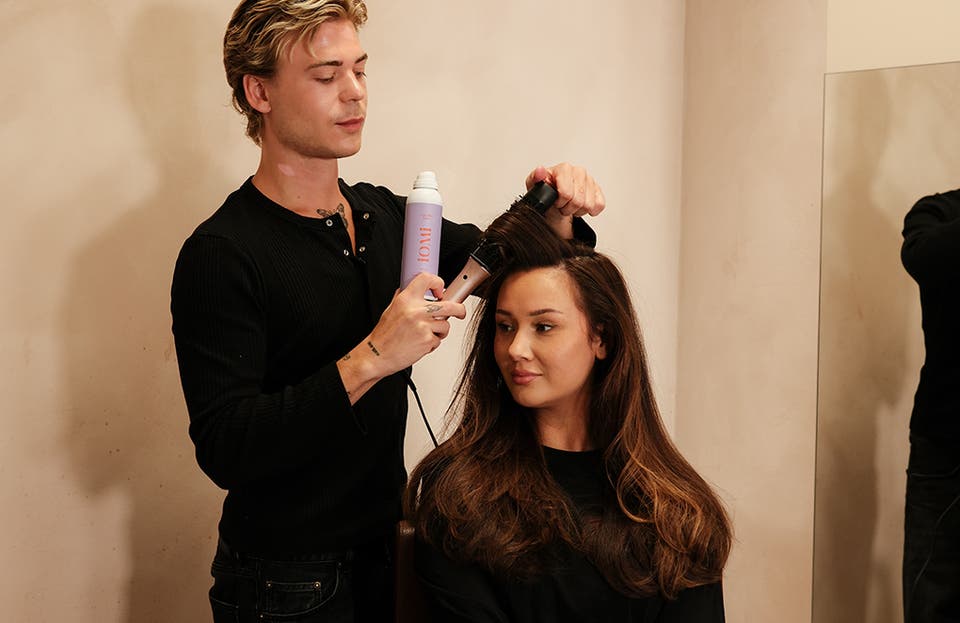 💆♀️ Hvis håret er fugtigt, start med at føne det igennem. Hvis håret er tørt, kan du børste det igennem, indtil Volume Mist er helt tørret.