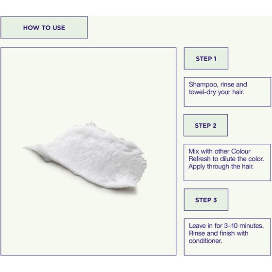 Shamponer håret og applicer derefter Color Refresh i håndklædetørret hår. Lad det sidde i mindst 3 minutter, skyl håret og afslut behandlingen med balsam. Brug handsker.