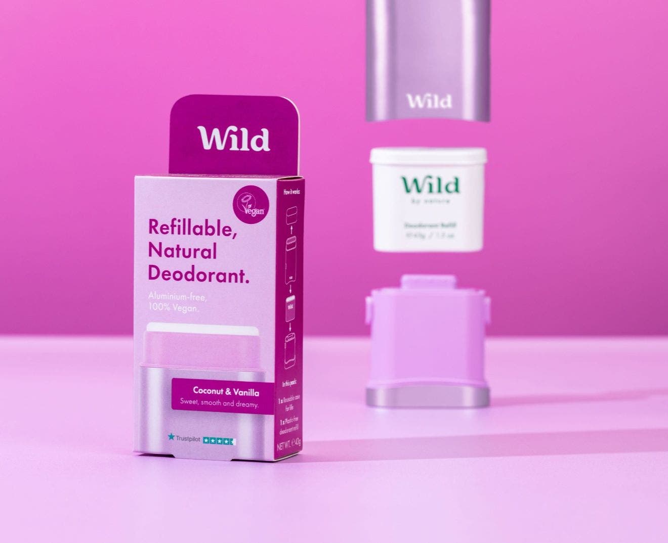 Wild on sarja luonnollisia ja uudelleen täytettäviä deodorantteja ilman kertakäyttömuovia. Wildin avulla saat luonnollisen, alumiinittoman ja ympäristöystävällisen vaihtoehdon, joka pitää sinut raikkaana ja tuoksuna koko päivän.
