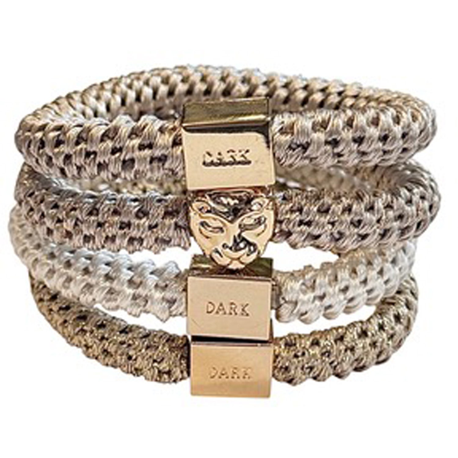 Det flettede designet med gulldetaljer gir en raffinert finish som fungerer like godt som et stilrent armbånd når strikkene ikke er i bruk.