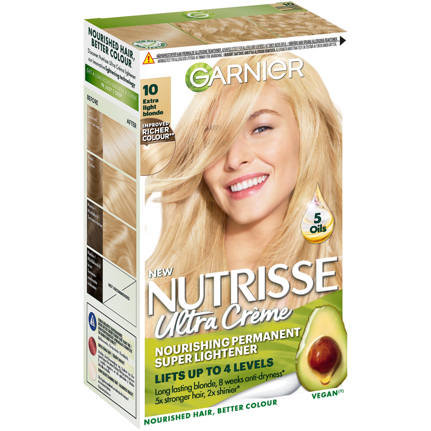 Garnier Nutrisse Ultra Crème 1.0 Svart gir deg en dyp svart farge med 100% gråhårdekning som holder i opptil 8 uker. Denne nærende hårfargen er beriket med 5 oljer som pleier håret under fargeprosessen og gir et sterkere, blankere resultat.