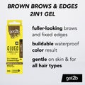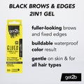 got2b Glued 4 Brows & Edges Tinted Black er en praktisk 2-i-1-gel som både farger og fikserer øyenbryn samt hårlinjer for et fyldig og veldefinert resultat. Denne øyenbrynsgelén gir et byggbart fargeresultat fra mørkebrun til svart og holder i opptil 24 timer.