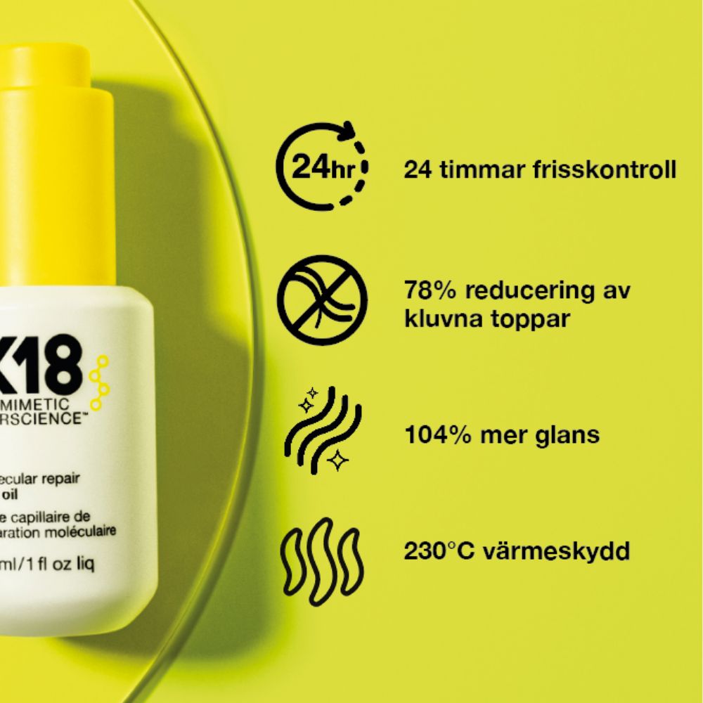 Det unika med denna hårolja är dess förmåga att gå längre än att bara tämja friss. K18 Molecular Repair Hair Oil tränger djupt in i håret för att reparera specifika skador som orsakar friss. Oljan ger en hållbar lösning genom att stärka håret från insidan.