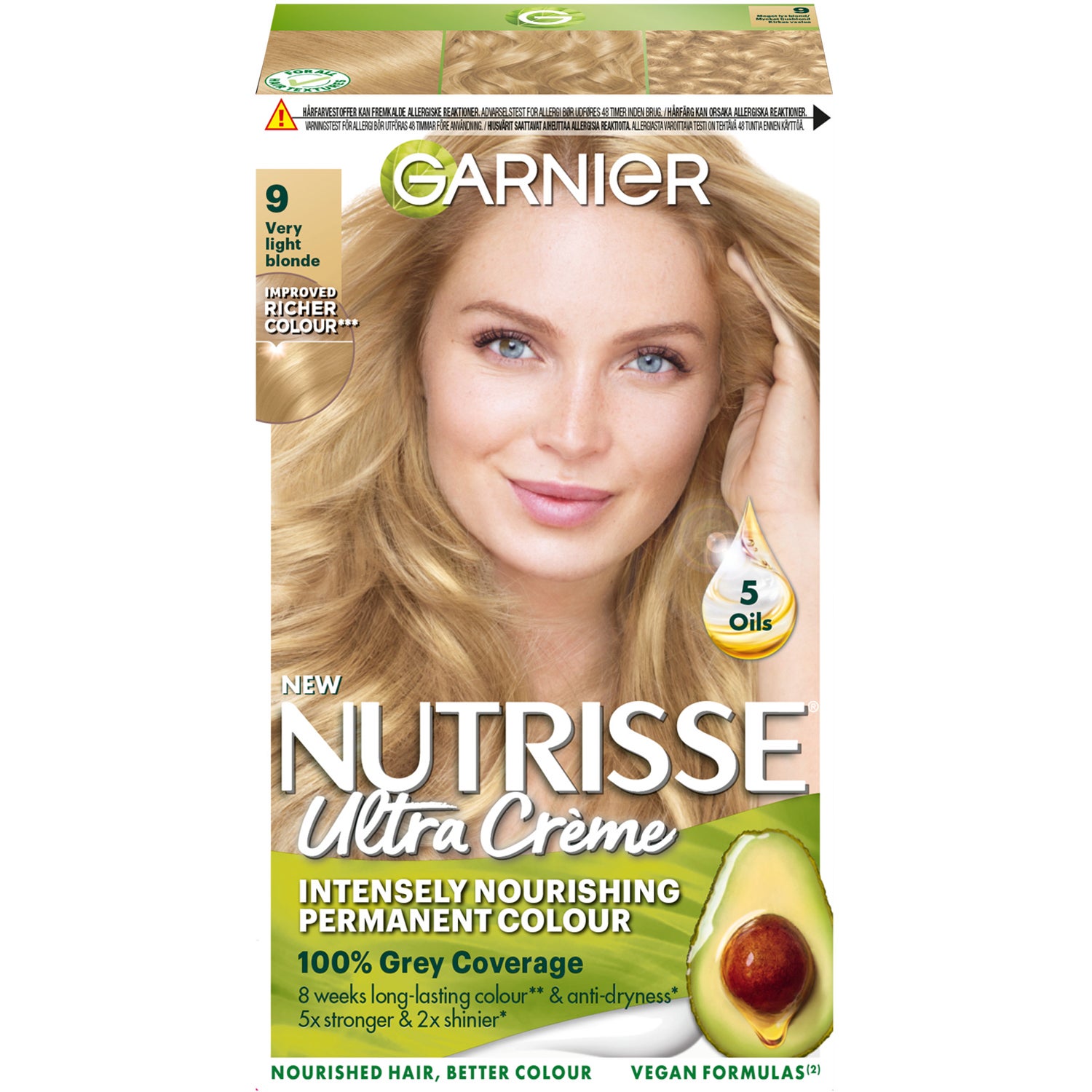 Garnier Nutrisse Ultra Crème 9 Very Light Blond är en närande permanent hårfärg som ger ett varaktigt färgresultat och täcker gråhår helt. Den veganska formulan är berikad med 5 oljor inklusive avokado för att vårda håret samtidigt som den ger en vacker mycket ljus blond nyans.