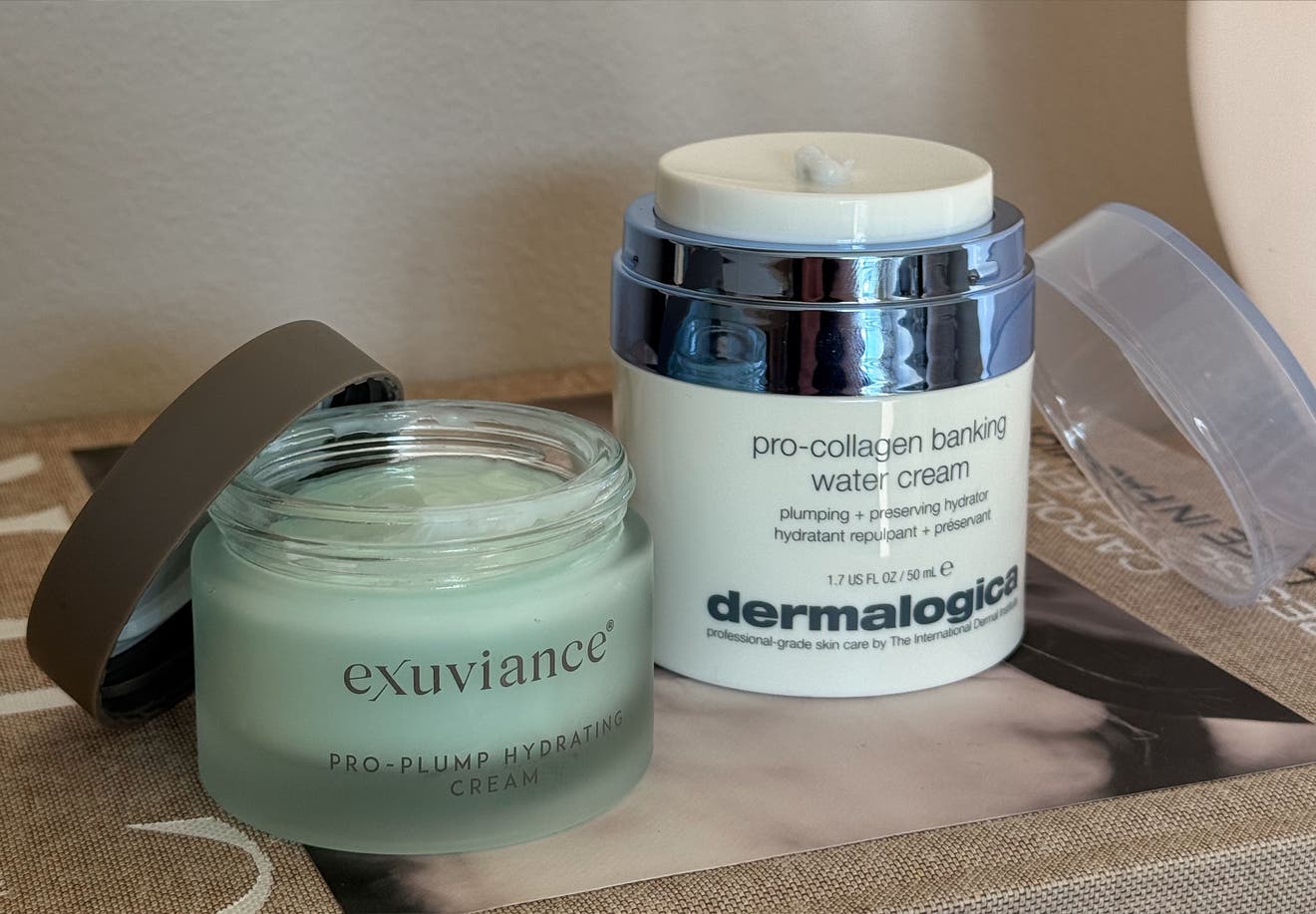 Exuviance levererar en ljuvligt babyblå och nästan svalkande kräm som gör vad den lovar. Pro-Plump känns djupt återfuktande men inte fet och plumpar små torrhetslinjer på en gång. För mig som är yttorr och aknebenägen är ingredienslistan en fullträff. Fukt utan tilltäppta porer, tack och bock.