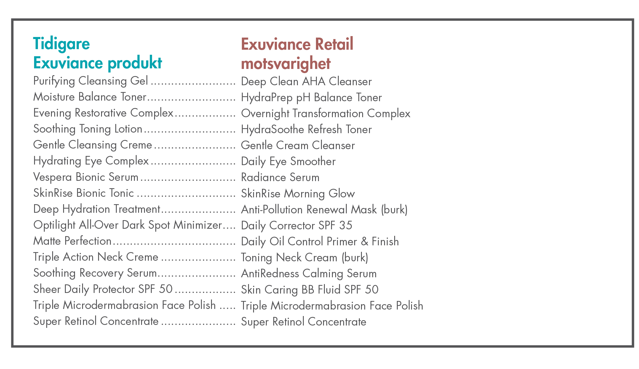 Exuviance satsar stort och gör en spännande relansering av sitt varumärke! Flera spännande nyheter gör entré och även tidigare sortimentet har uppdaterats med nytt namn och ny design. Se nedan för att se vilka produkter som byter förpackning och namn.